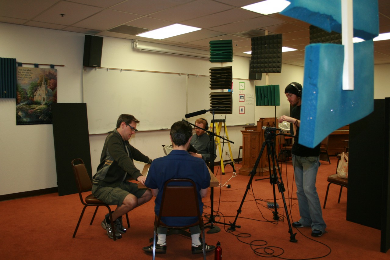 Jacob Sidney (Gabriel) and Eric Curtis Johnson (Gregory) have a drink before the adventure begins, on the first day of recording “The Man Who Was Thursday.” Director Andrew Wahlquist, Producers David Stanton and Ben Stanton