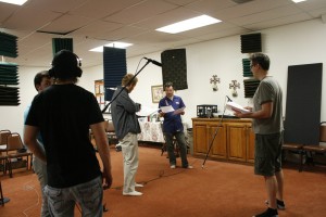 Jacob Sidney (Gabriel) and Eric Curtis Johnson (Gregory) in a lonely intellectual duel, on the first day of recording “The Man Who Was Thursday.” Director Andrew Wahlquist and producers David Stanton and Ben Stanton